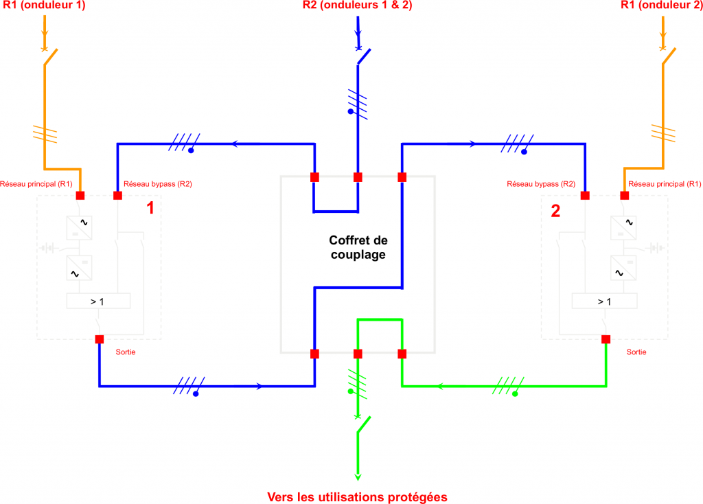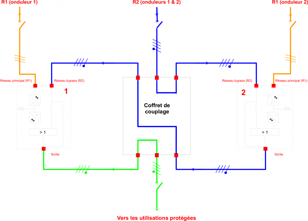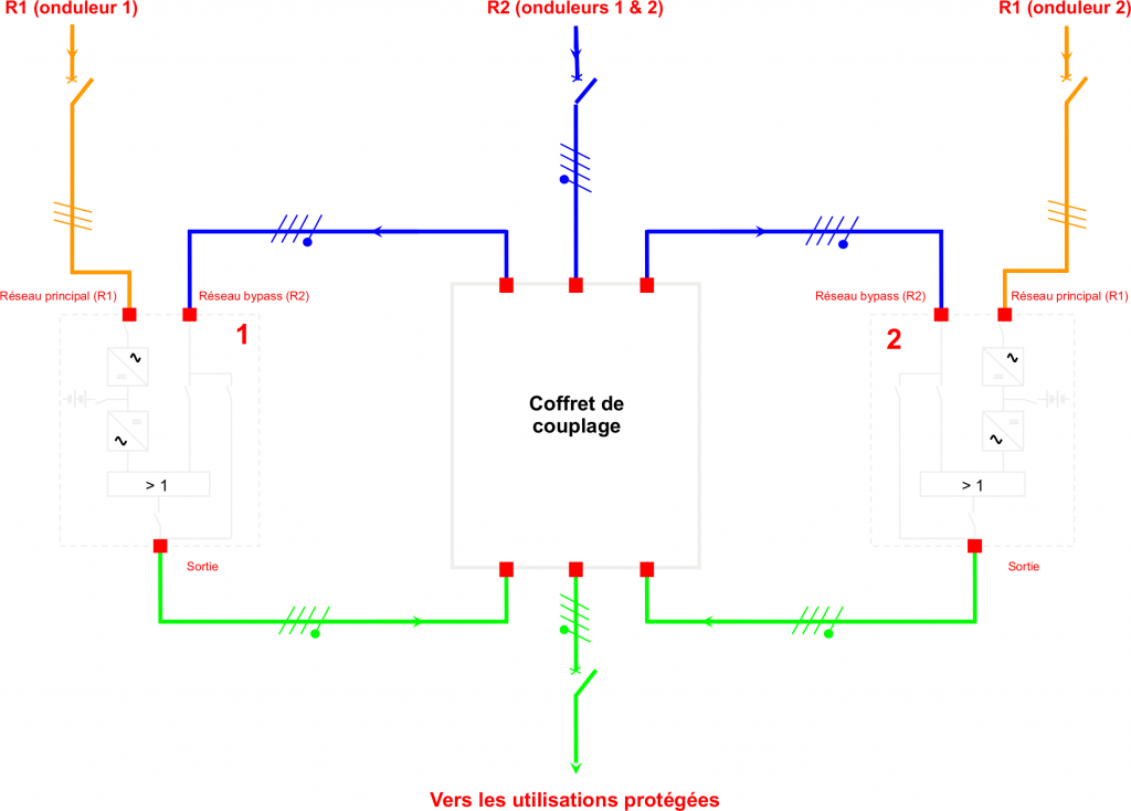L’onduleur 1 alimente le réseau secours de l’onduleur 2.